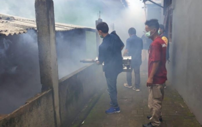.Fogging yang dilaksanakan Dinkes Kota Tangerang ke tengah permukiman warga, Minggu (23/2).