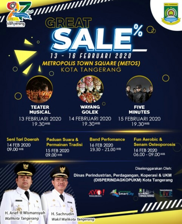 Dalam rangkaian pembukaan Tangerang Great Sale 2020, lanjut Arief, akan diisi dengan berbagai acara dalam rangkaian HUT ke-27 Kota Tangerang Ke-27 di antaranya pertunjukan teater musikal, Wayang Golek, dan tampilan band-band ternama.