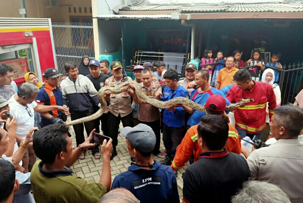 Ular raksasa tersebut berhasil diamankan tim Damkar UPTD Batuceper BPBD Kota Tangerang, Sabtu (18/1/2020). Sebanyak 6 personil tim Damkar Batuceper berhasil mengevakuasi ular sepanjang 5 meter melalui proses yang cukup menegangkan.