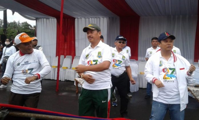 Walikota Tangerang Arief R Wismansyah (tiga kiri), tampil di atas panggung pada kegiatan senam bersama DPRD Kota Tangerang. (Ist)